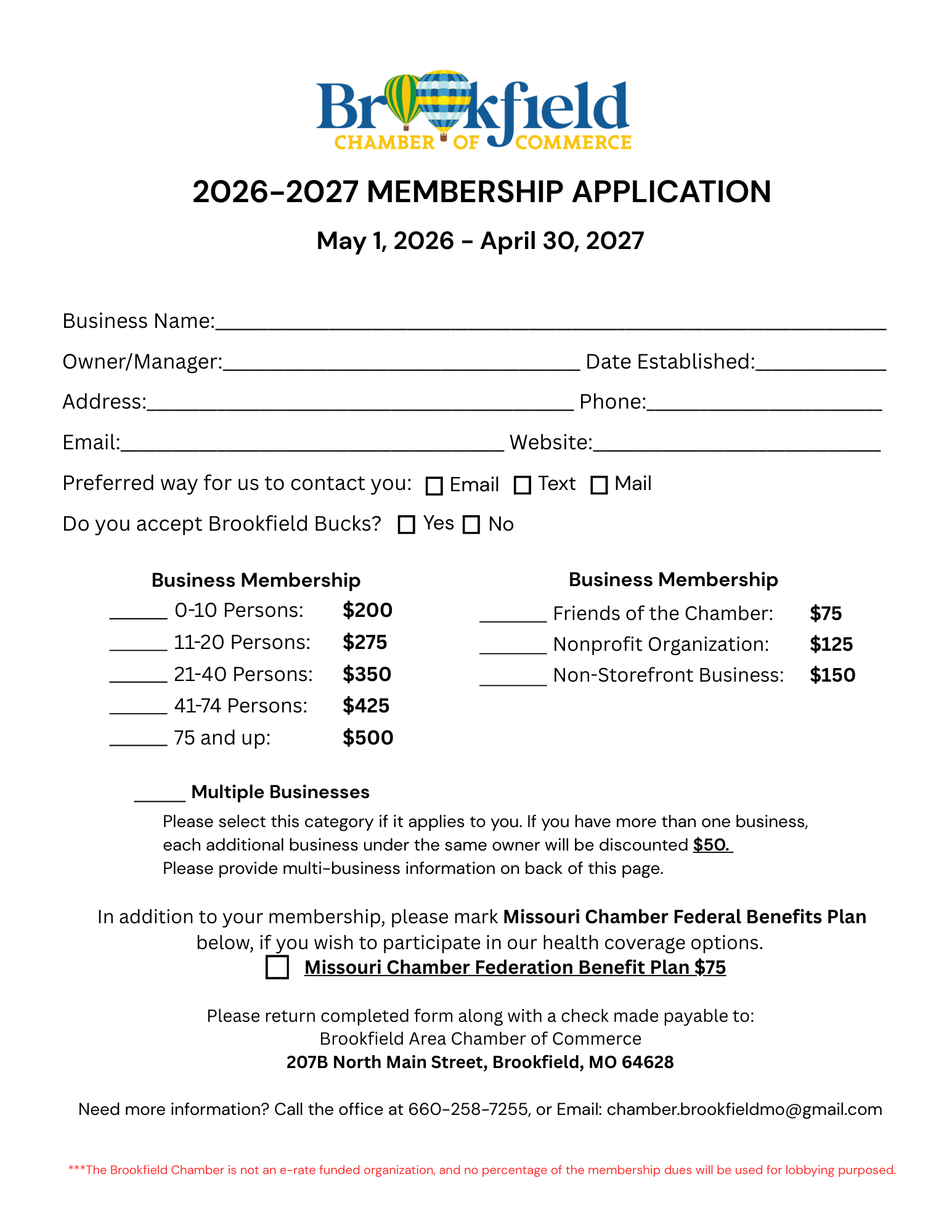 For more information on the Brookfield Area Chamber of Commerce or to inquire about joining the Chamber, please call the Chamber office at 660-258-7255. Click here for an email form and we will give you a call!